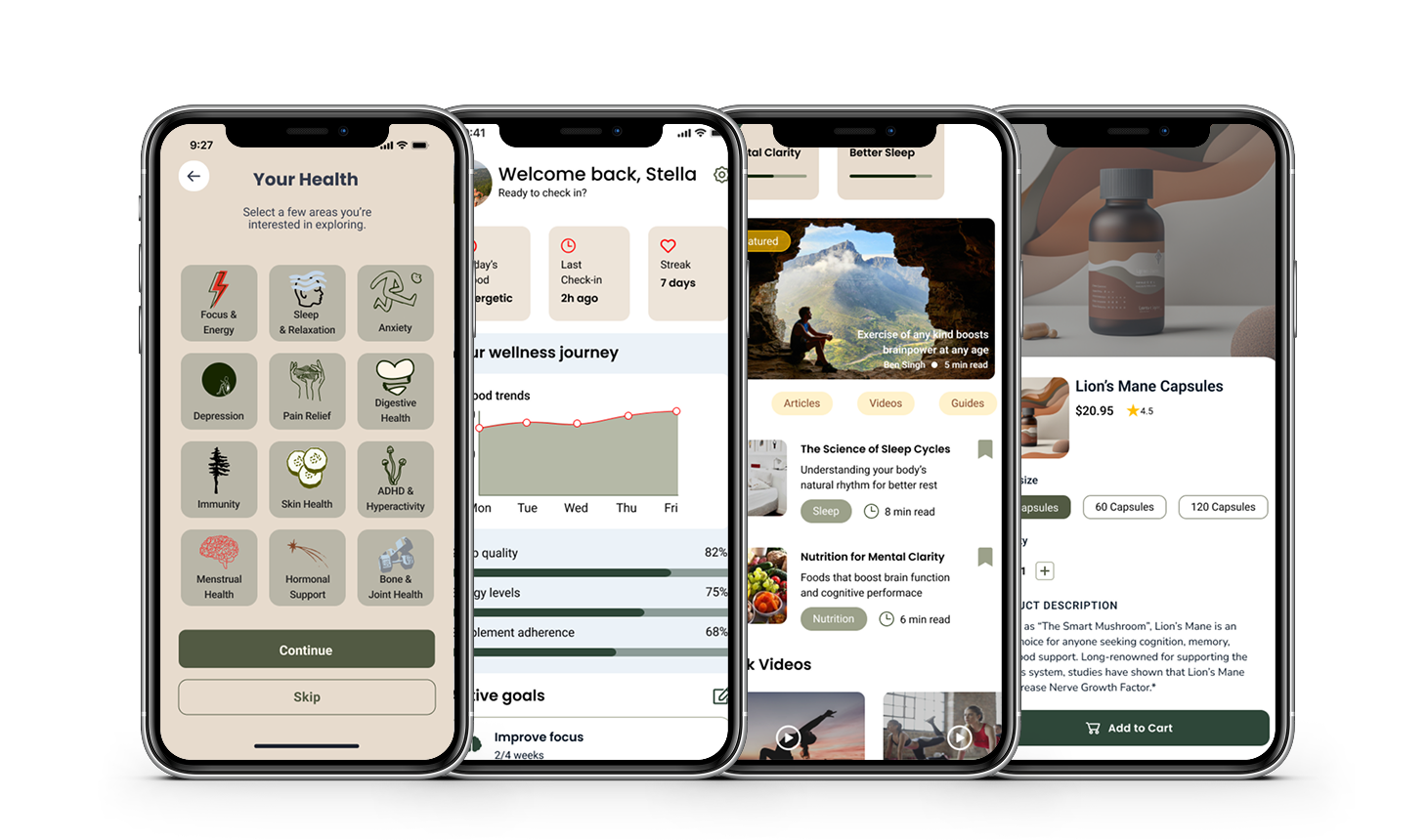 The interface mirrors the product: intentional, minimal, and emotionally supportive. From the mushroom logo (symbolizing growth and intelligence) to the soft illustration style, every brand element speaks to wholeness and harmony. The app itself guides users gently, never pushing, always inviting. Daily logs, personalized check-ins, and guided educational content create a layered experience that evolves with the user.